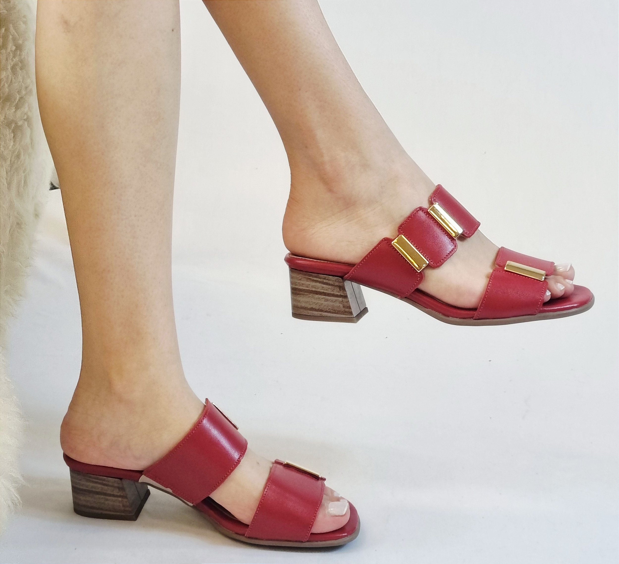 O tamanco em couro legítimo com salto médio é a escolha