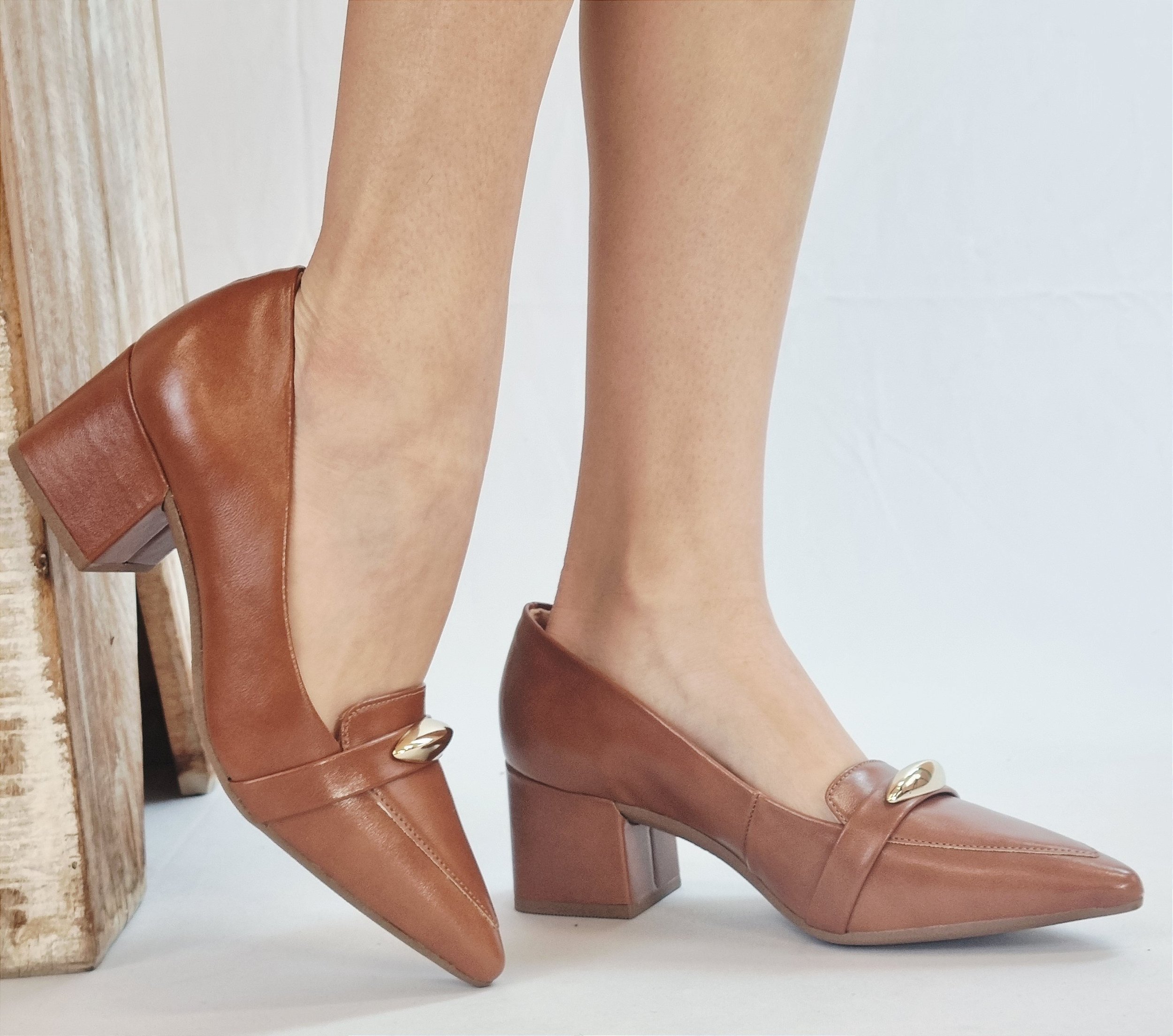 🔸 Detalhes em caramelo / detalhe dourado 🔸 Numeração 34 ao 39 🔸 Salto quadrado confortável 🔸 Material sintético