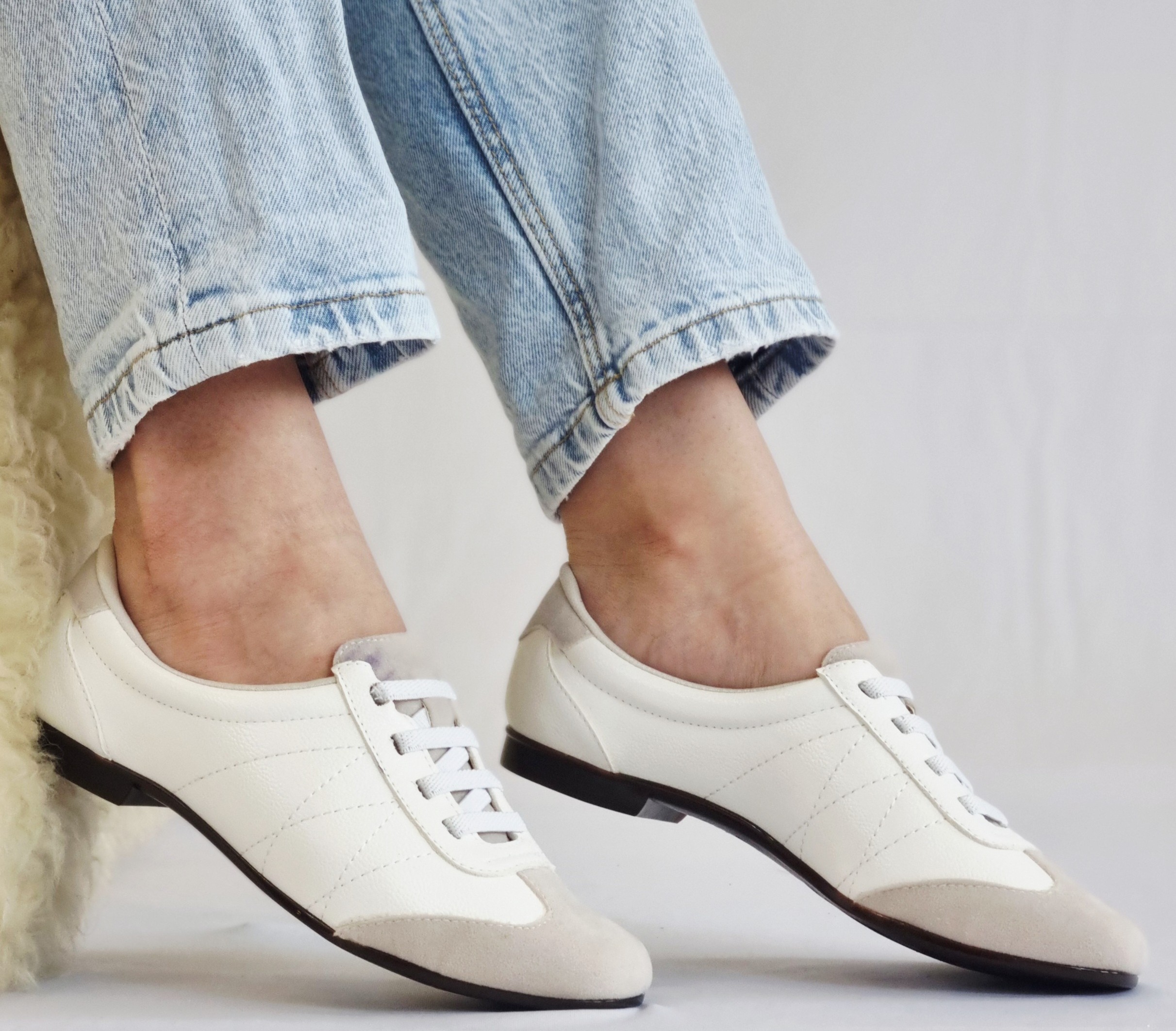 TÊNIS EM COURO 680002 BRANCO / PONTEIRA NOBUCK CINZA / CADARÇO EM ELÁSTICO
